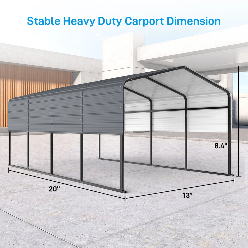 With dimensions of 13′ W x 20′ D, this carport offers a spacious and flexible solution. The eave height of 102 inches provides ample clearance, making it suitable for larger vehicles or for creating a comfortable outdoor space for workshops, parties, or barbecues.